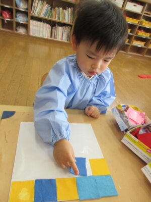 色画用紙、1枚1枚にボンドをつけて貼り合わせたり、