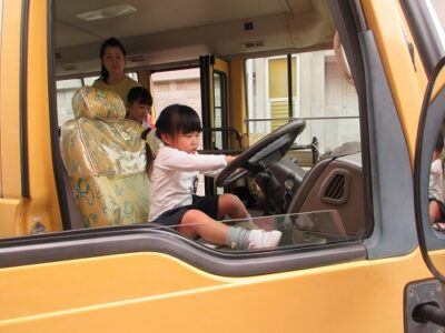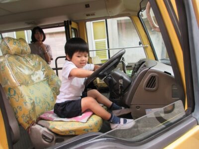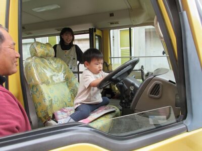園児全員が1人ずつ、クラクションを鳴らす練習をしました。
